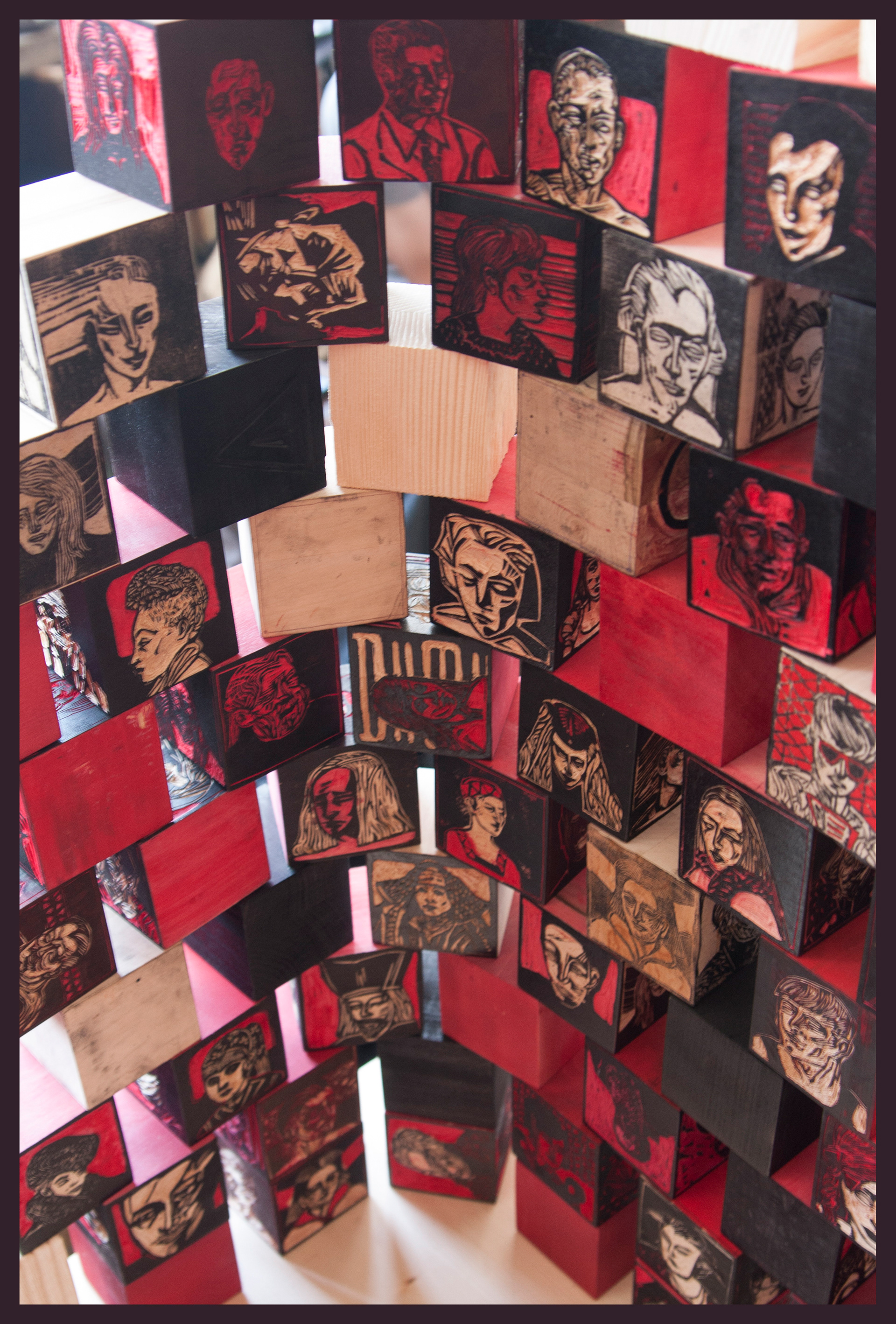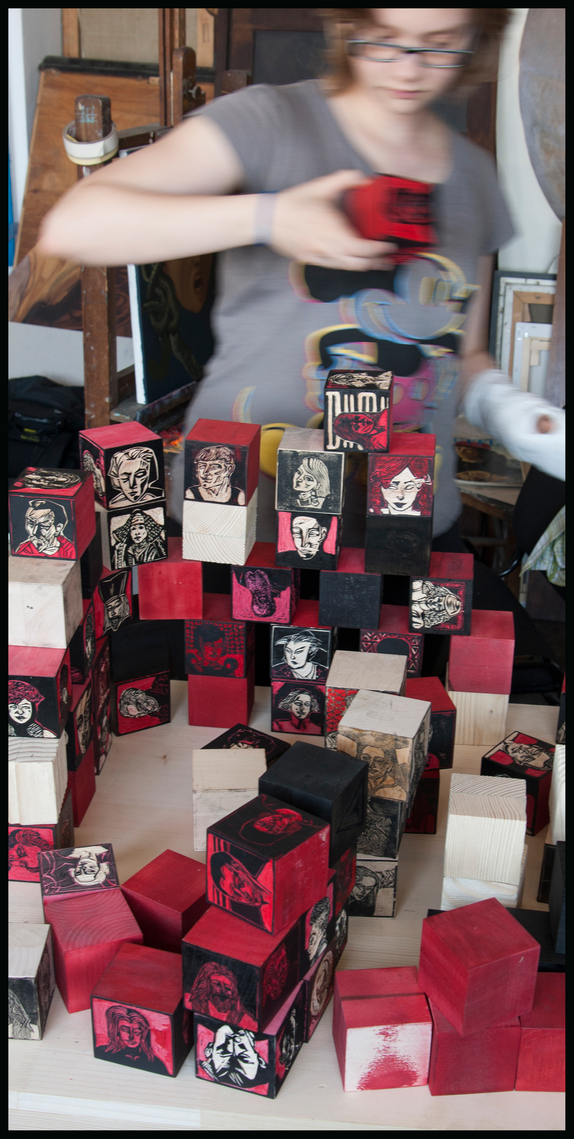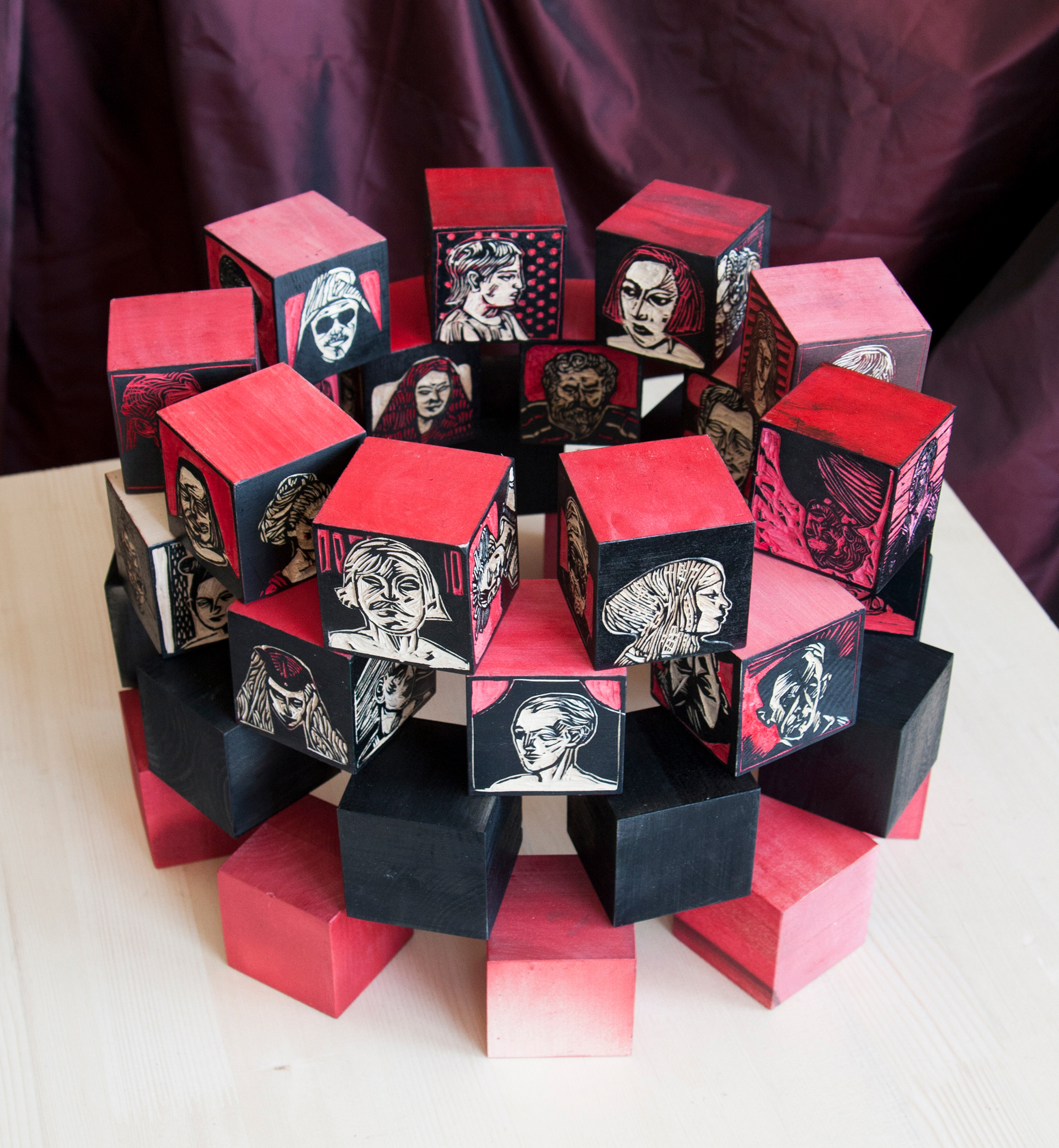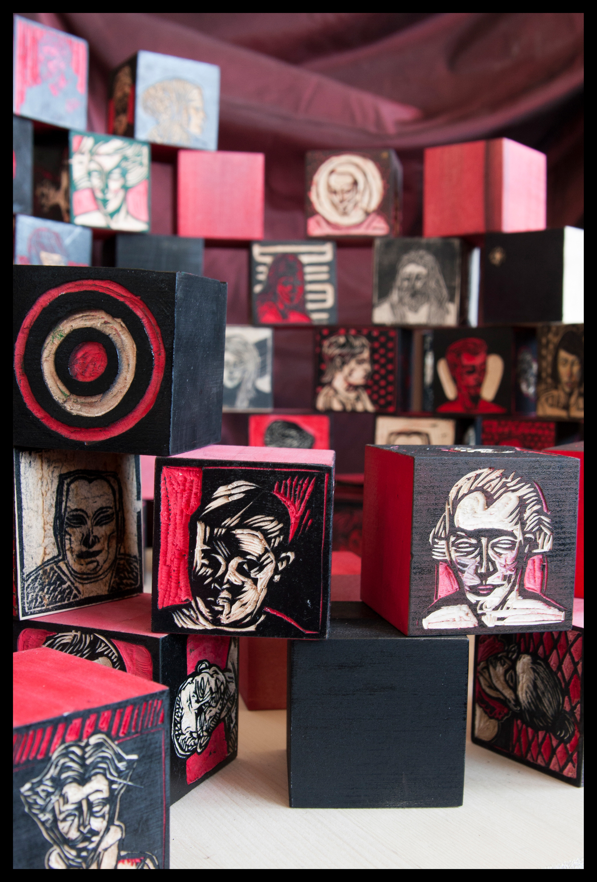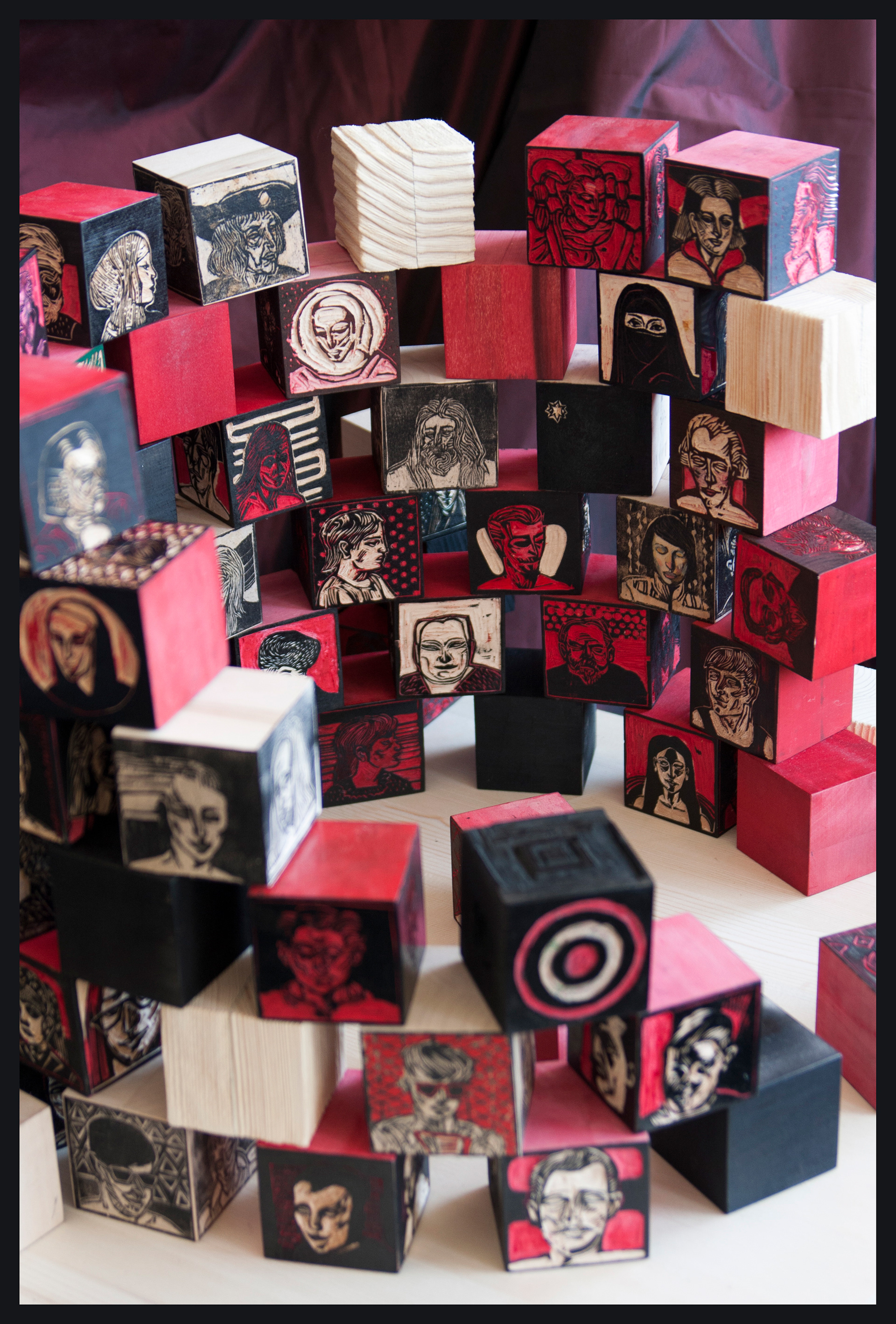 "Souvenirs from Babylon" is a series of woodcuts made on cubes. Each cube symbolizes a brick of the Tower of Babel.